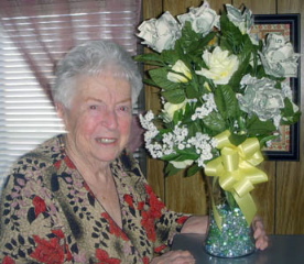 This momentous occasion was celebrated at a Calumet Township game with a sumptuous feast and a room decorated with posters and balloons. Cathy was presented a silk yellow rose floral arrangement on behalf of all the players. Interspersed among the yellow roses were a half dozen roses of a rather greenish color apparent in the accompanying photo. The petals in those special roses totaled one dollar for every year of Cathy's life.