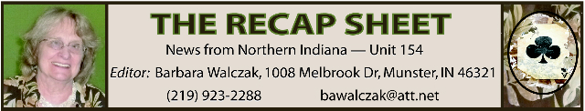 Anna writes — Shortly after our son was born in 1976, my husband, Bob, suggested that we take bridge lessons at Purdue Calumet. The instructor was none other than our own Howie Schmid, who taught continuing education. Our main motivation was to be able to play bridge with our friends who were also new to the game. Upon learning the basics, we played party bridge up until five years ago. (I still play party bridge occasionally.)