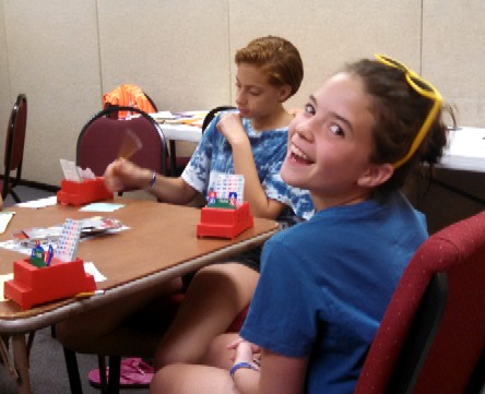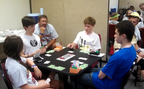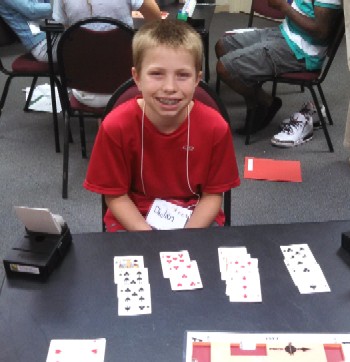 Youth Bridge Camp 2014Campers and staff from 16 states met in Carlinville IL on June 22-28 for the fifth annual Youth Bridge Camp. Forty-two students ages 10 through 15 enjoyed a week of bridge lessons, tournaments and recreation.Campers were divided into four groups -- Clubs, Diamonds, Hearts and Spades -- based on their bridge experience. Five to six hours a day was devoted to bridge lessons and play in sectional-rated pair and Swiss team games. A list of all winners is here. Bryan Delfs, education program manager for ACBL, served as tournament director and teacher of the Hearts group. He told the campers that his name was "Director Please". The camp program also included free time every day to enjoy sports, including volleyball, racquetball, archery, "9-square" basketball, mini-golf and pool. The lakefront offered swimming, paddleboats, slides and the very popular water trampoline. Chris and Mary Lattan Shaw of Carlinville founded the camp in 2009 and they work year-round to plan and promote it. The ACBL Education Foundation provided a grant to set up the first camp. Other support has been provided by Southern Illinois Unit 223, the District 8 Board, duplicate clubs in Edwardsville and Effingham, and individual donors. The next Youth Bridge Camp is scheduled for June 23 through July 3, 2015.