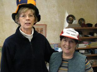 ![]() Lynn St. John and Mary Jo Sergent discussed their hat sizes. |