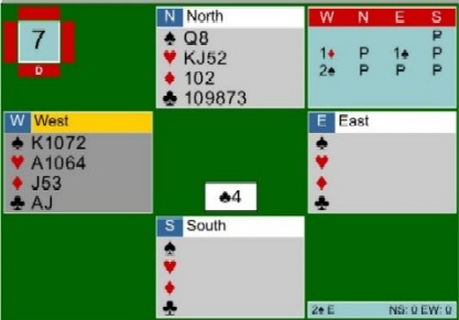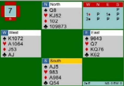 this: If either opponent has 4 hearts, return to hand with the ♠Q, draw trumps (throwing clubs from dummy), and hope that spades split favorably. This is equivalent to scenarios (1) and (2) mentioned above. If both opponents follow to the two heart leads, return to hand with the ♠Q, draw trumps (throwing a club from dummy), and establish the spades. This is equivalent to scenario (3) above, except you don’t need the clubs to split. It might seem like we are splitting hairs, only gaining in very specific scenarios (e.g., when East is exactly 1-3-7-2). However, as a student of the game, I view it as a moral victory if I find the correct technical line of play, whether or not it leads to a material difference in the outcome. |