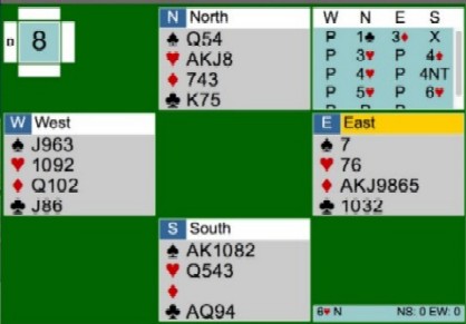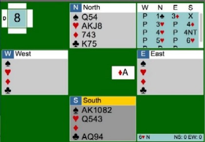 The last scenario is forthcoming on the actual deal, as shown in the diagram on the left. But perhaps there is a better line of play? After all, suits tend to break badly when the opponents preempt the bidding. Try