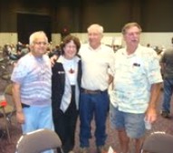 News of making Life Master frequently occurs at regionals, as players seek that elusive “gold.” This year, there was an unusual happening. There were three new life masters from ONE team at this tournament over three days of team events. The team consisted of (photo, left to right) Jay Shah (Bronze LM) and Jo-Ellyn Ryall of St. Louis, Orvin Lindell of Lafayette (IN) and Dale Kenrich of West Lafayette (IN).