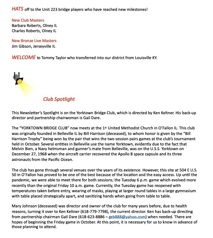 you joined the virtual bridge games!Since most face-to-face bridge games are still not being held, the Central and Southern Illinois Virtual Bridge Club is thriving. Again, I’m including a schedule below of the weekly games plus free lessons that are being offered.