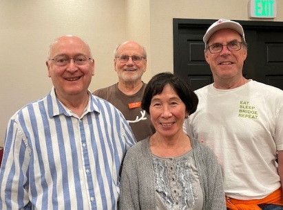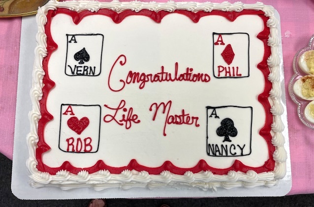 Congratulations to four new Life Masters from the Champaign-Urbana area. The Bridge at Ginger Creek club hosted a party in July to celebrate the accomplishments of (photo, l. to r.) Vern Knapp of Tolono, Nancy Rader of Champaign and Phil Reeser of Monticello. Too shy for a photo was new Life Master Rob Husband of Savoy. Welcome to new ACBL members !