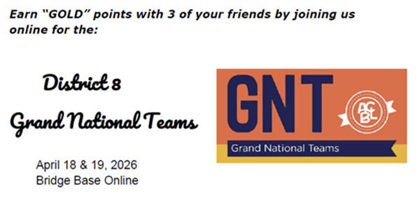 North American Pairs - Come play in District 8's NAP Finals on BBO on November 8th, 2026. You must have pre-qualified by playing in North American Pair Qualifier games held in area clubs during June, July and August. These games award silver and red points. The flyer will be available soon. Conditions of Contest to follow.
